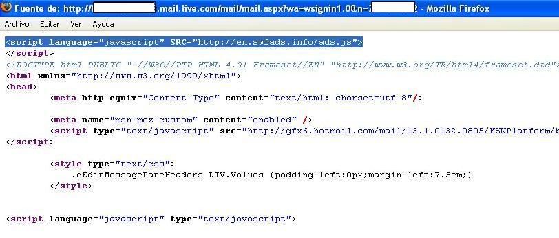 Screeshot del codigo fuente del banner de publicidad de Hotmail, he seleccionado la primera lineal la misma que se le ha inyectad al banner.